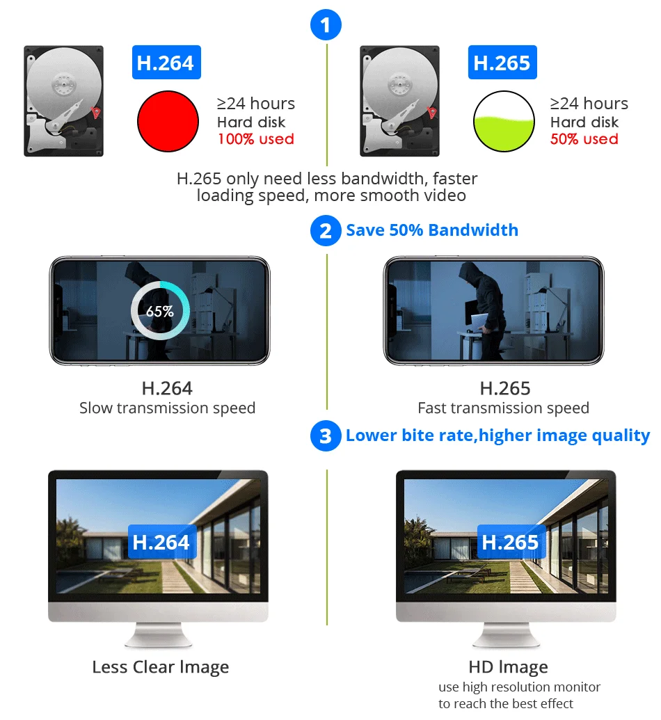 H.265 (HEVC) Video Compression doubles the coding efficiency compared with its predecessor H.264. That means H.265 video saves around 50% of the bit rate at the same quality of coding.