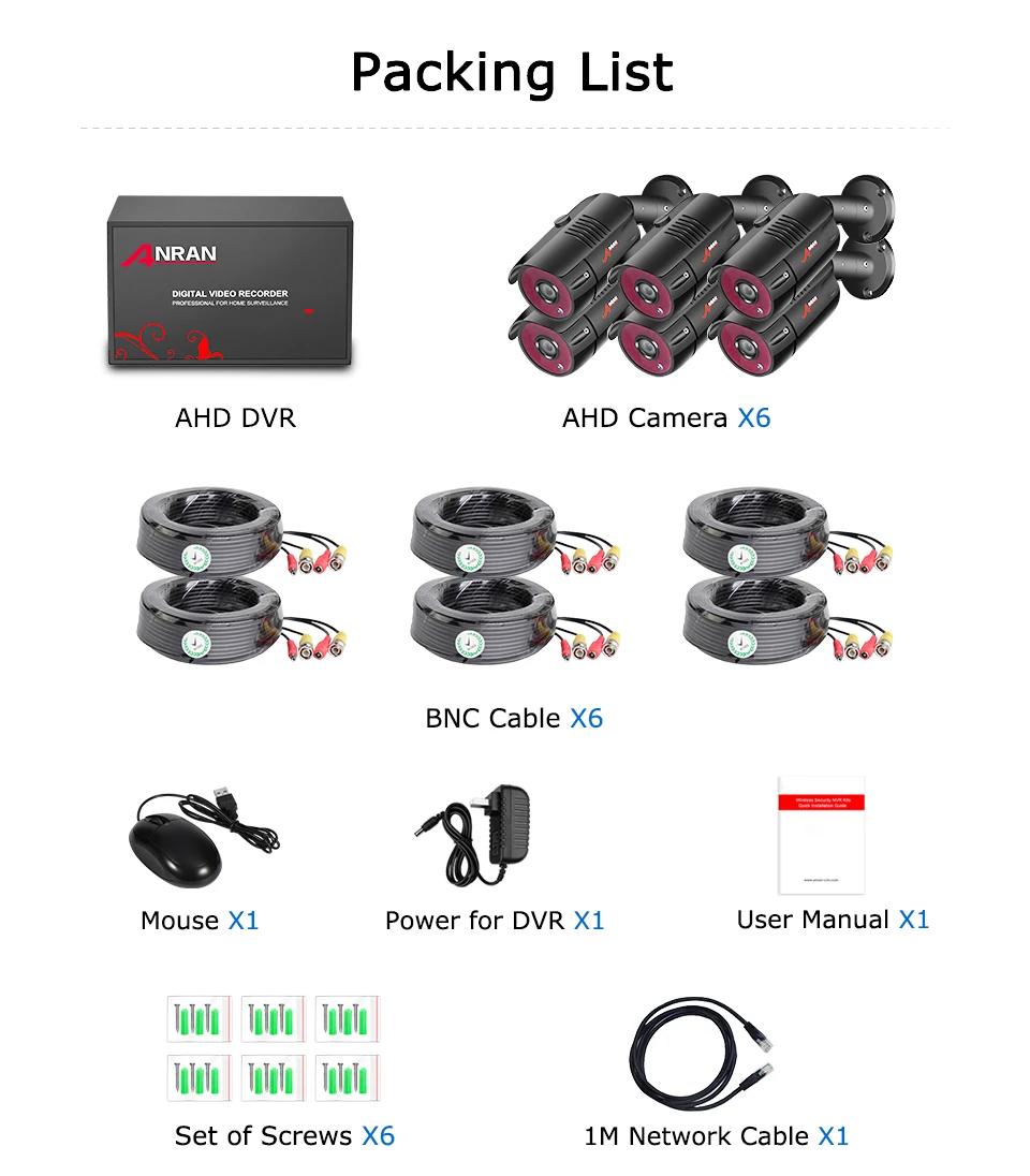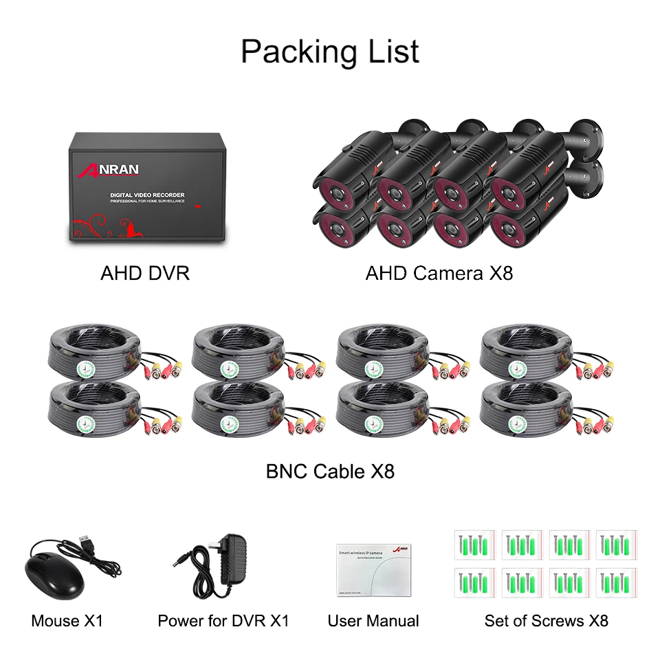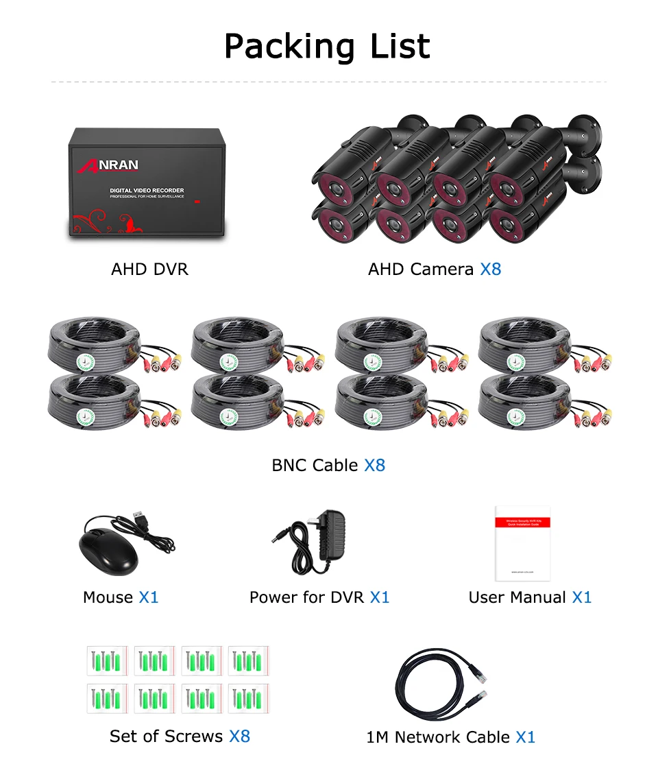 1 x 4/8 CH 1080P Digital Video Recorder 2/4/6/8 x 1080P Analog HD Camera2/4/6/8 x 18m(60ft) Power Video Plug and Play BNC Cable2/4/6/8 x Mounting Screws1 x 12V Power Supply for DVR1 x Mouse for DVR 1 x English user guide
