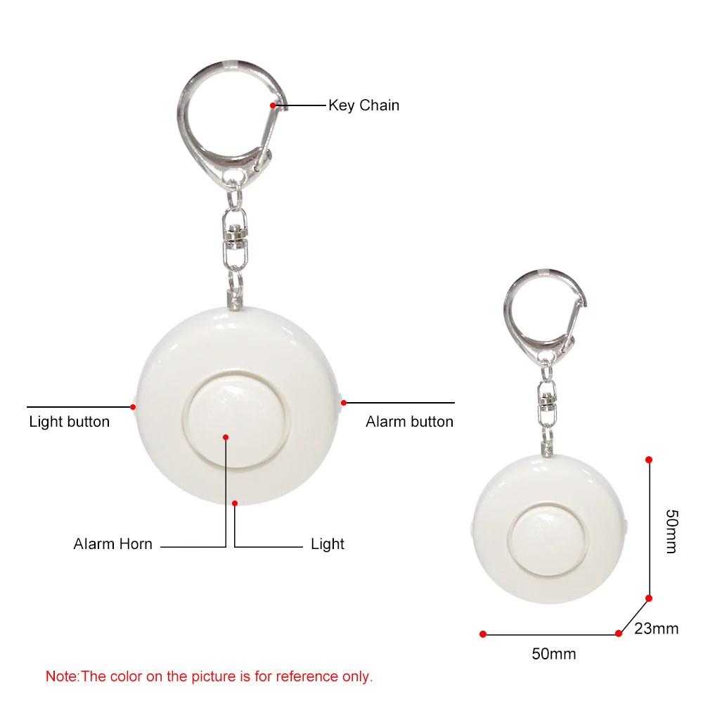 Features:1.High-Decibel Design: Alarm sound up to 130dB, deterring the attacker, scaring away bad guys, getting timely protection. It runs up to 40 minutes continuous piercing safety alarm, the sound will also give warning to others around you that you are in danger. (3*AG13 button batteries included.)2.Suitable for A Variety of People: It is an ideal self defense key chain especially for women, kids, explorers, elderly, etc., it can increase an individual's feelings of confidence, independence and the personal safety they need in order to save their lives.3.Portable Key Chain Design: Small size, light-weight and portable, easy to carry, cute decoration. A key buckle design is easy to attach with keys, handbag, backpack, wallet's zipper, cellphone's strap, lady's bag, men's belt, even jeans, much convenient. It could be an accessory when you are travelling, hiking, camping, hunting, walking the dog, etc.4.Simple Operation: Pull the pin to activate the alarm then insert it back to stop it. You can also press the button to activate the alarm and loosen the button to stop it. 5.Mini Flashlight Function: Press the mini LED button to activate bright LED light for nighttime illumination, for illumination dark walkways and finding the keyhole or find your seats in the theater, etc.Specifications:Powered by: 3*AG13 Battery (included)Working Voltage: 4.5VWorking Current: 30mASound Loudness: 125dB-130dBLED Flashlight: SupportColor: Black ( Black, White optional )Material: ABSItem Size: 50*50*23mmPackage List:1 * Personal Security Alarm