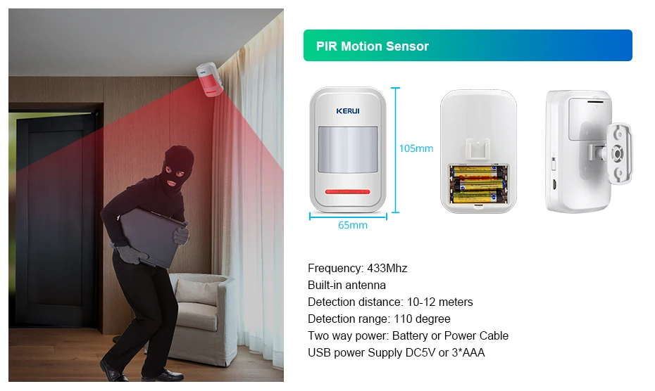 | Kerui 5pcs 3pcs Rechargeable 5V USB 433MHz Wireless PIR Sensor Motion Detector For GSM PSTN Security Alarm System |
