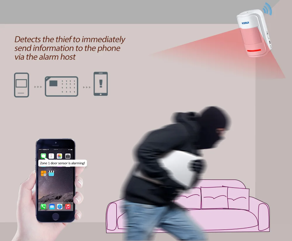 KERUI 433Mhz Wireless Intelligent PIR Motion Sensor Detector For GSM PSTN Home Alarm System without antenna Infrared Note:the item must work with alarm system,it can not work independent. Package 1: P819 Motion Sensor *3( batteries not included) Package 2: P819 Motion Sensor *5( batteries not included)