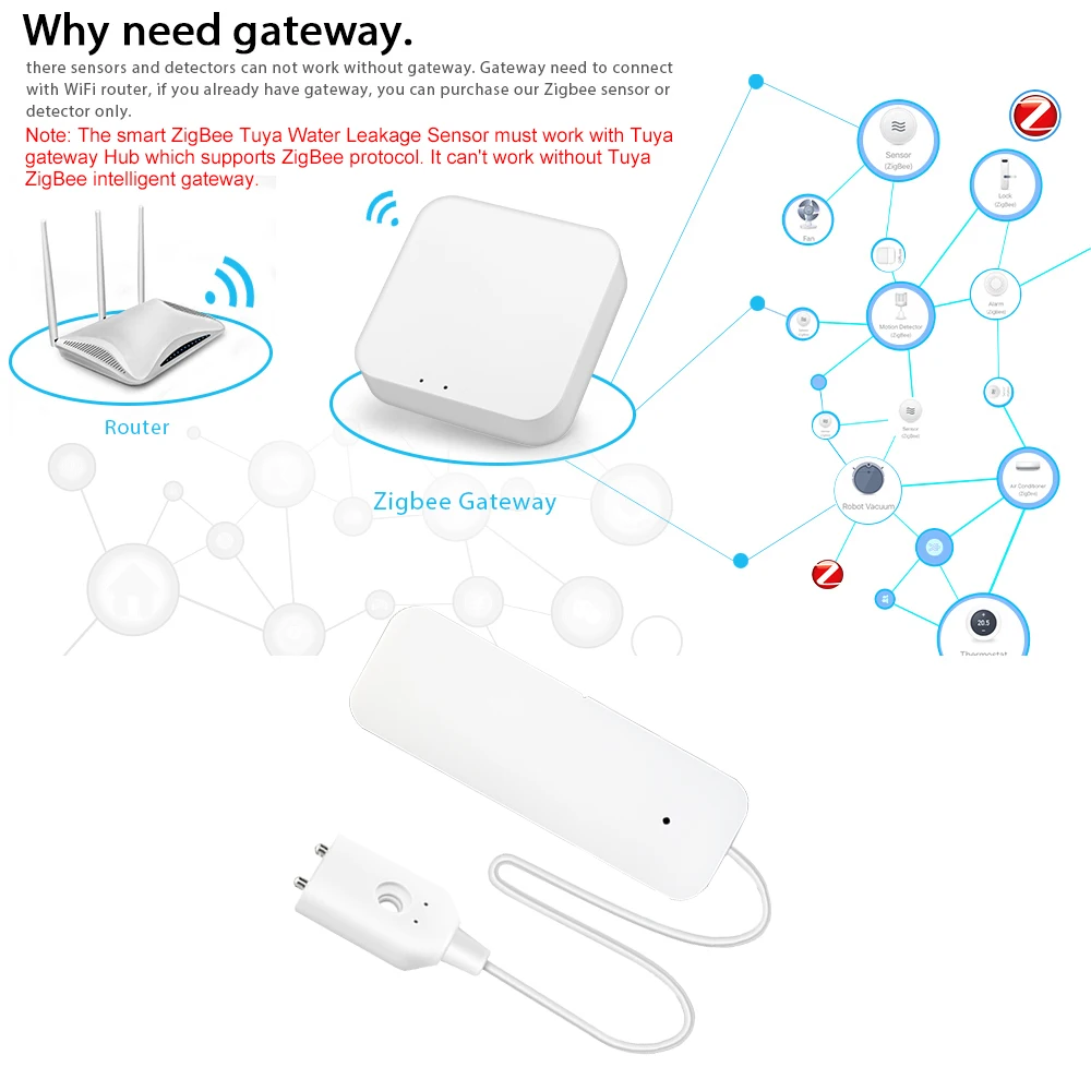 Note: The smart ZigBee Tuya Water Leakage Sensor must work with Tuya gateway Hub which supports ZigBee protocol. It can't work without Tuya ZigBee intelligent gateway.