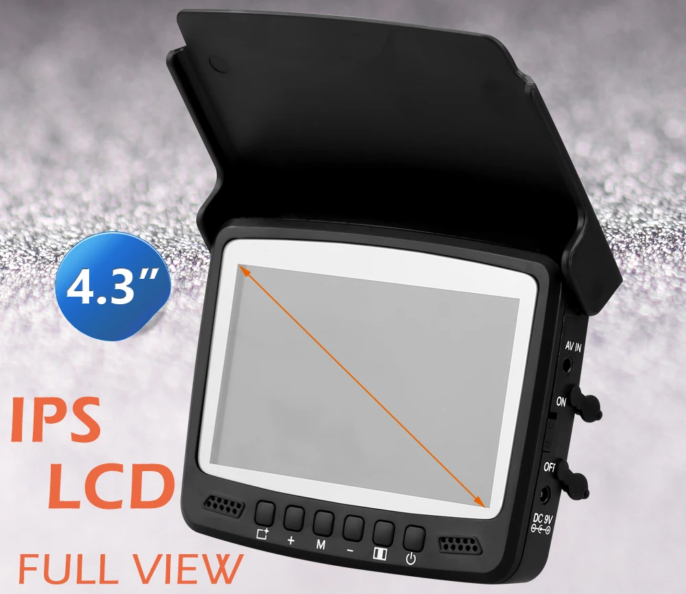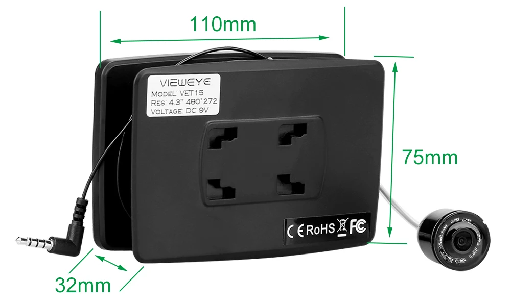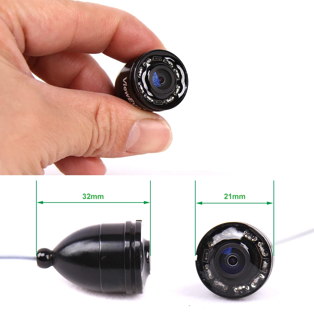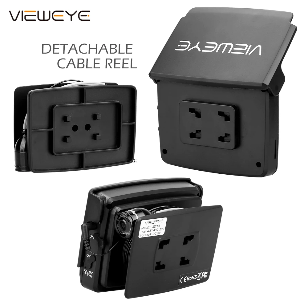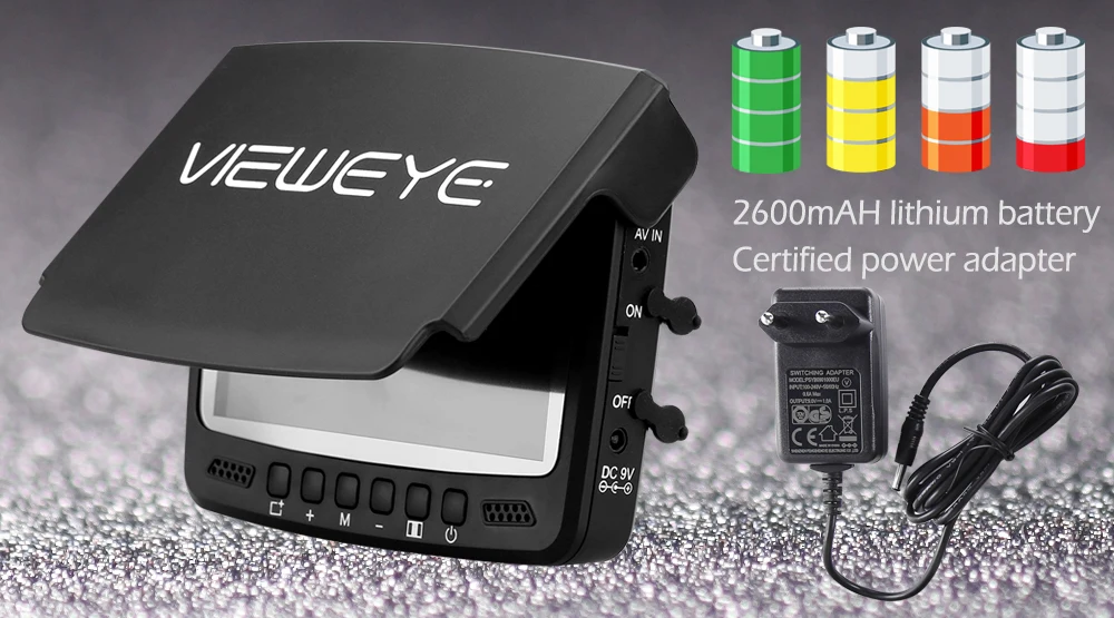 Buy now, there will be 1 pcs this car charger in the parcel as a gift.If you want to buy this car charger separately, you can click here. 8pcs IR infrared lampCan be turn off manuallyViewEye original patented camera holder 8 pcs infrared lamp, infrared lamp can be turn on/off manually by "+"or "-" at the monitor Monitor Specification:1. 4.3" IPS full view LCD color monitor2. Monitor Total Pixels: 480(H) X 272(V)3. Monitor power supply: DC 9V4. OSD language of the display: English, Russian (10 language available)5. 16:9 model6. With sun visor7. Rechargeable Battery: 2600MA Lithium battery, Working time: 6-8 hours8. Flexible, light weight and easy to carry9. The infrared high brightness Explicit monitoring.10. Operating Temperature: -20 degree to +60 degreeCamera Specification:1. Camera size: 32mm x 21mm2. Camera case material: strong metal case3. Camera glass material: sapphire glass4. Sensor size: 1/3 inch CMOS5. Total Pixels: 1000 TVL6. View angle: 120 degree7. Camera lights: 8PCS Infrared Lamp8. Cable length: 15/25 meters9. Camerawork current: 80MA10. Work condition: underwater11. Waterproof level: IP68New Detachable Cable Reel Patented design and easy to installStable and convenient IP 68 waterproofTested 20 meters deep waterproof under water Super strong battery, 6-8 hours continue working at full chargedWith certified power charger, more safe and faster charging 8pcs infrared lamp provide enough lights for night visionProvide good image with special lens IPS LCD much better than other LCDFull angle visibility New strong cableWaterproof & Strong & Corrosion ResistantSuitable for ice fishing seawater and any other water
