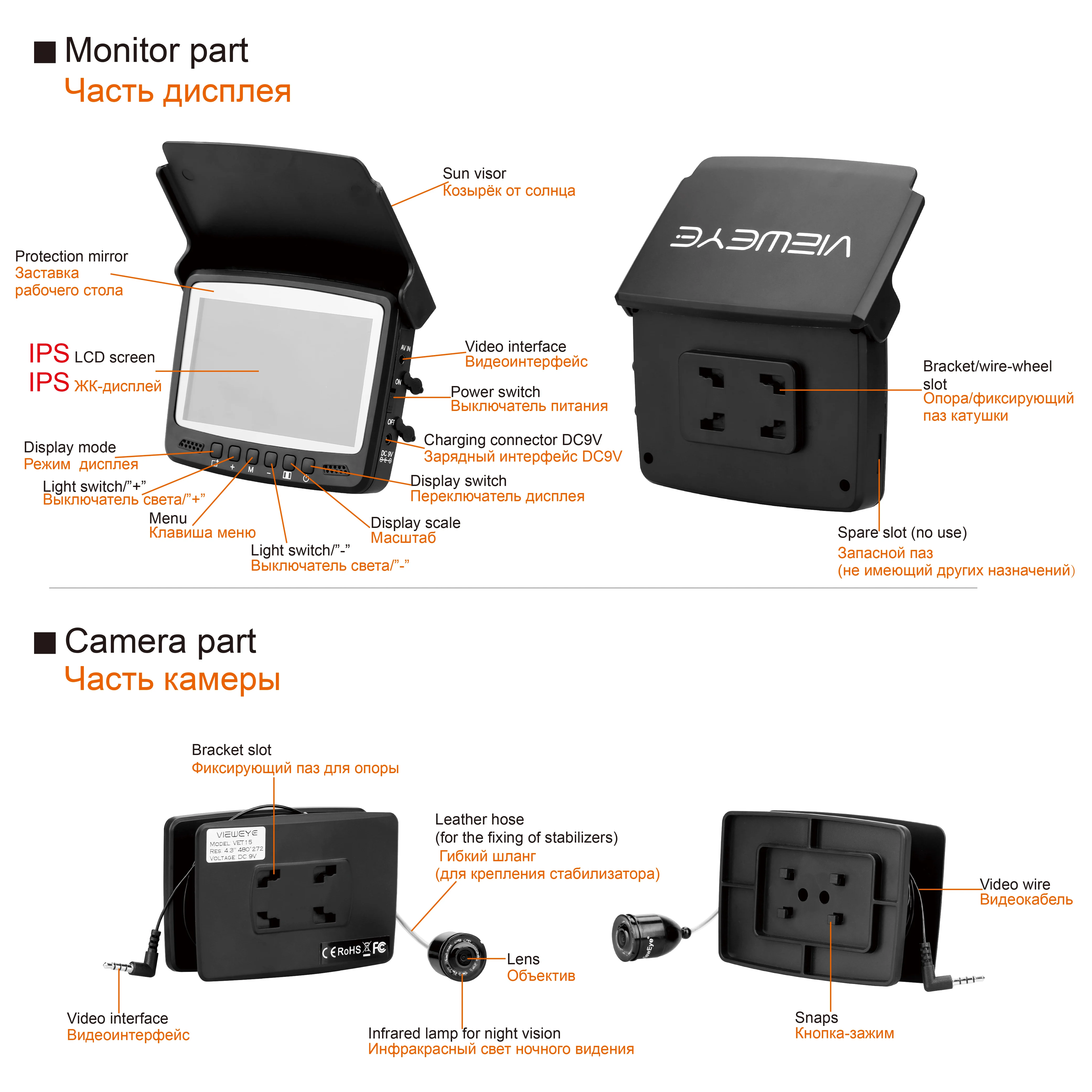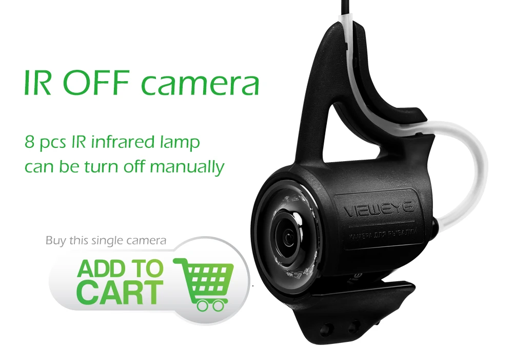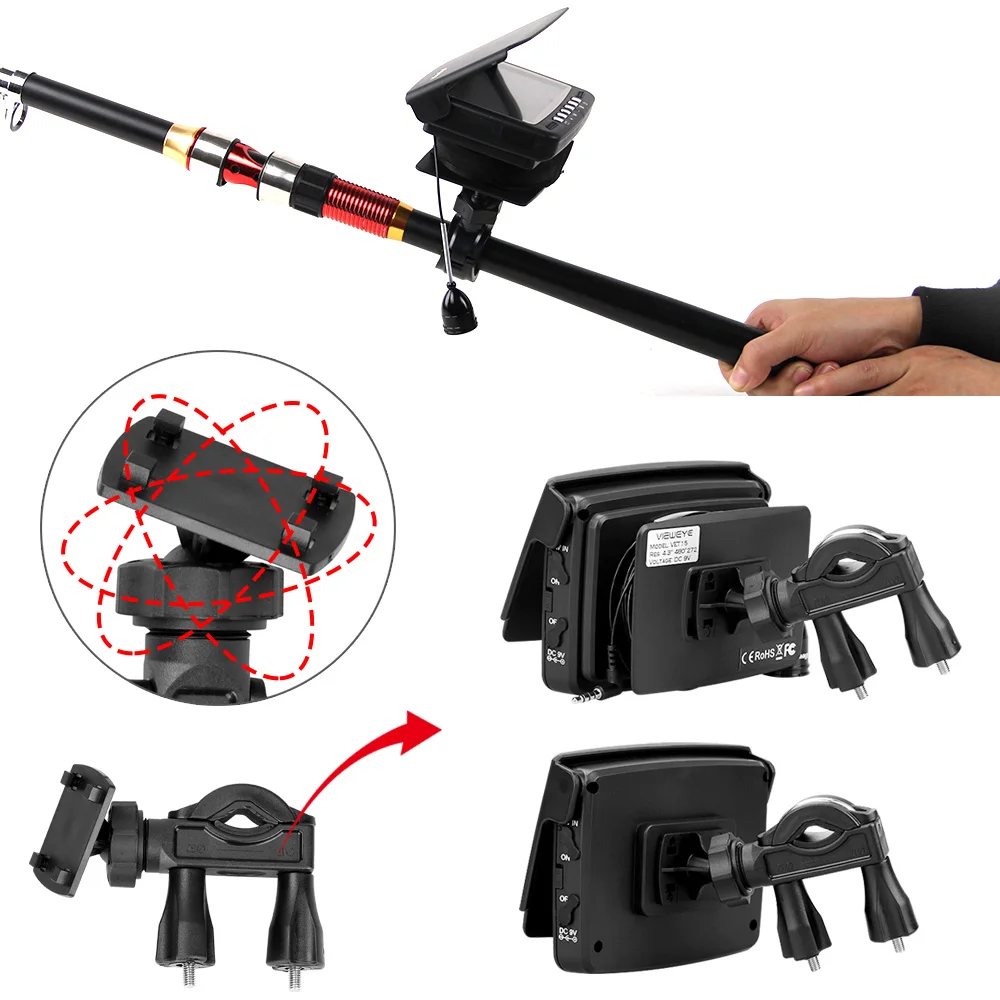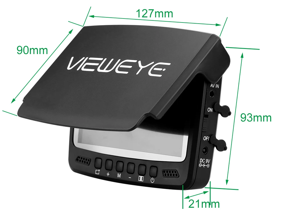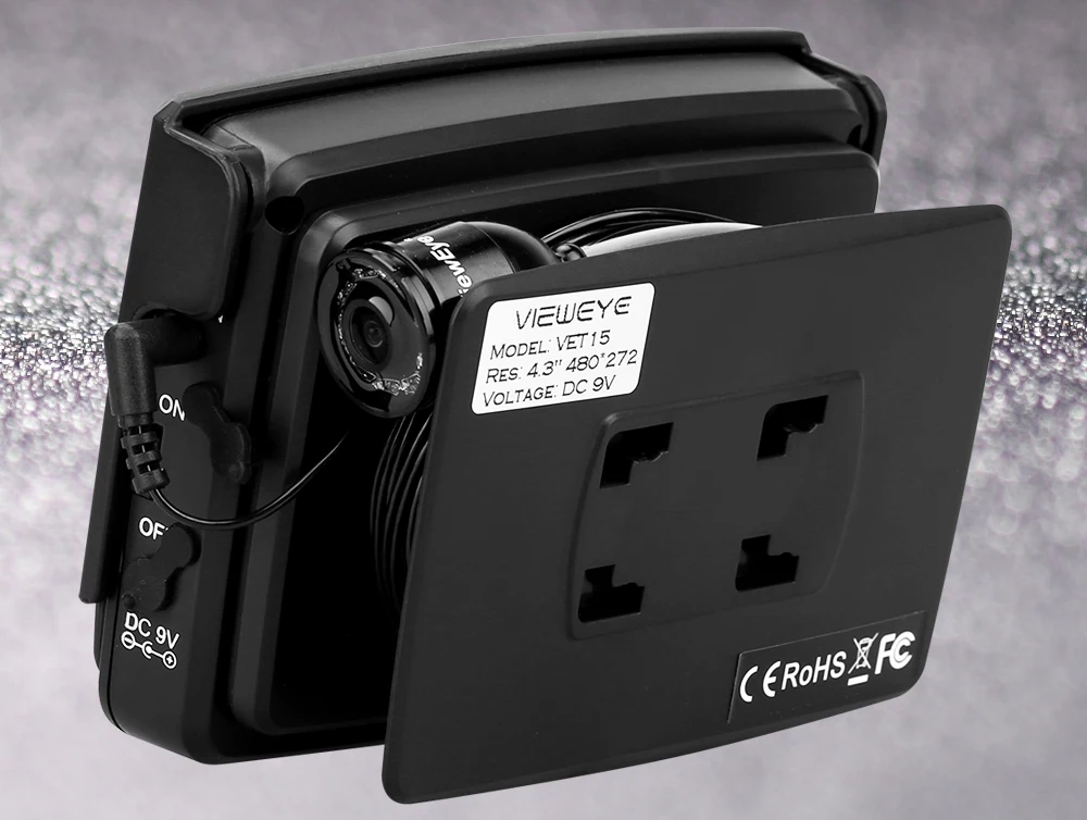 Buy now, there will be 1 pcs this car charger in the parcel as a gift.If you want to buy this car charger separately, you can click here. 8pcs IR infrared lampCan be turn off manuallyViewEye original patented camera holder 8 pcs infrared lamp, infrared lamp can be turn on/off manually by "+"or "-" at the monitor Monitor Specification:1. 4.3" IPS full view LCD color monitor2. Monitor Total Pixels: 480(H) X 272(V)3. Monitor power supply: DC 9V4. OSD language of the display: English, Russian (10 language available)5. 16:9 model6. With sun visor7. Rechargeable Battery: 2600MA Lithium battery, Working time: 6-8 hours8. Flexible, light weight and easy to carry9. The infrared high brightness Explicit monitoring.10. Operating Temperature: -20 degree to +60 degreeCamera Specification:1. Camera size: 32mm x 21mm2. Camera case material: strong metal case3. Camera glass material: sapphire glass4. Sensor size: 1/3 inch CMOS5. Total Pixels: 1000 TVL6. View angle: 120 degree7. Camera lights: 8PCS Infrared Lamp8. Cable length: 15/25 meters9. Camerawork current: 80MA10. Work condition: underwater11. Waterproof level: IP68New Detachable Cable Reel Patented design and easy to installStable and convenient IP 68 waterproofTested 20 meters deep waterproof under water Super strong battery, 6-8 hours continue working at full chargedWith certified power charger, more safe and faster charging 8pcs infrared lamp provide enough lights for night visionProvide good image with special lens IPS LCD much better than other LCDFull angle visibility New strong cableWaterproof & Strong & Corrosion ResistantSuitable for ice fishing seawater and any other water