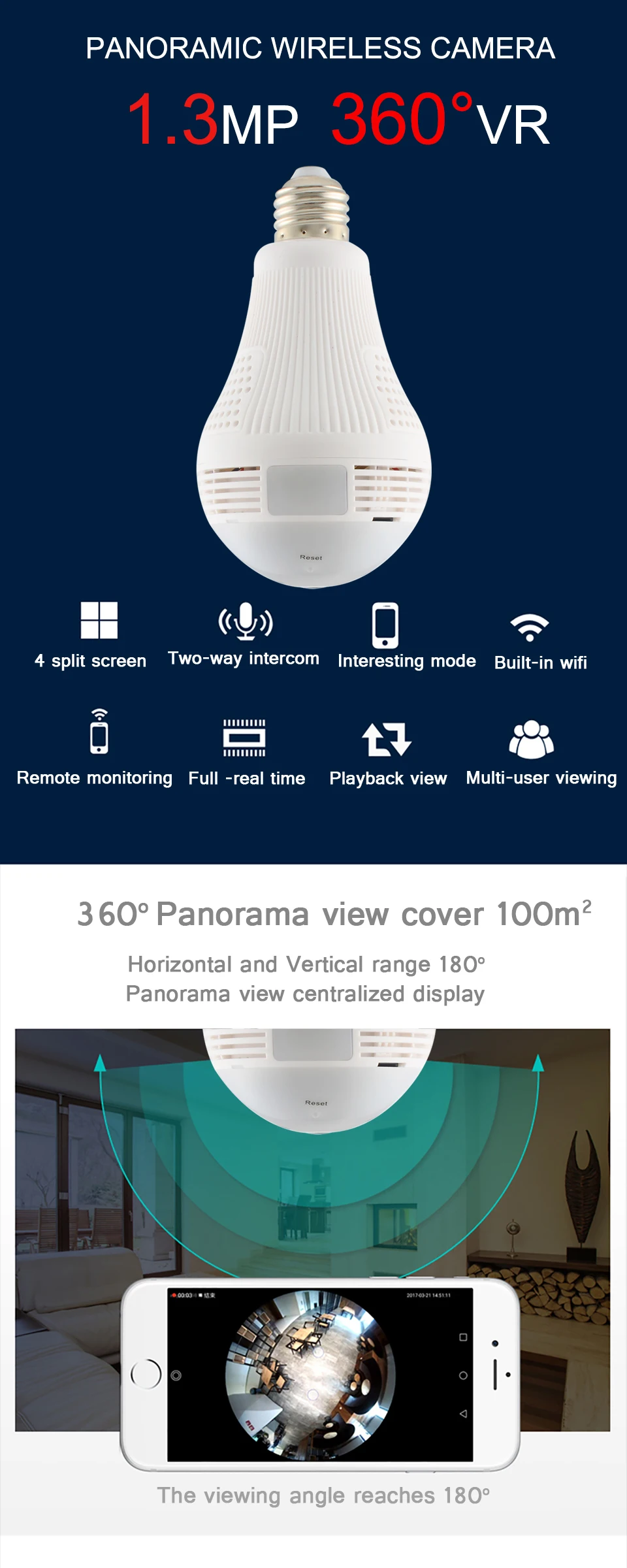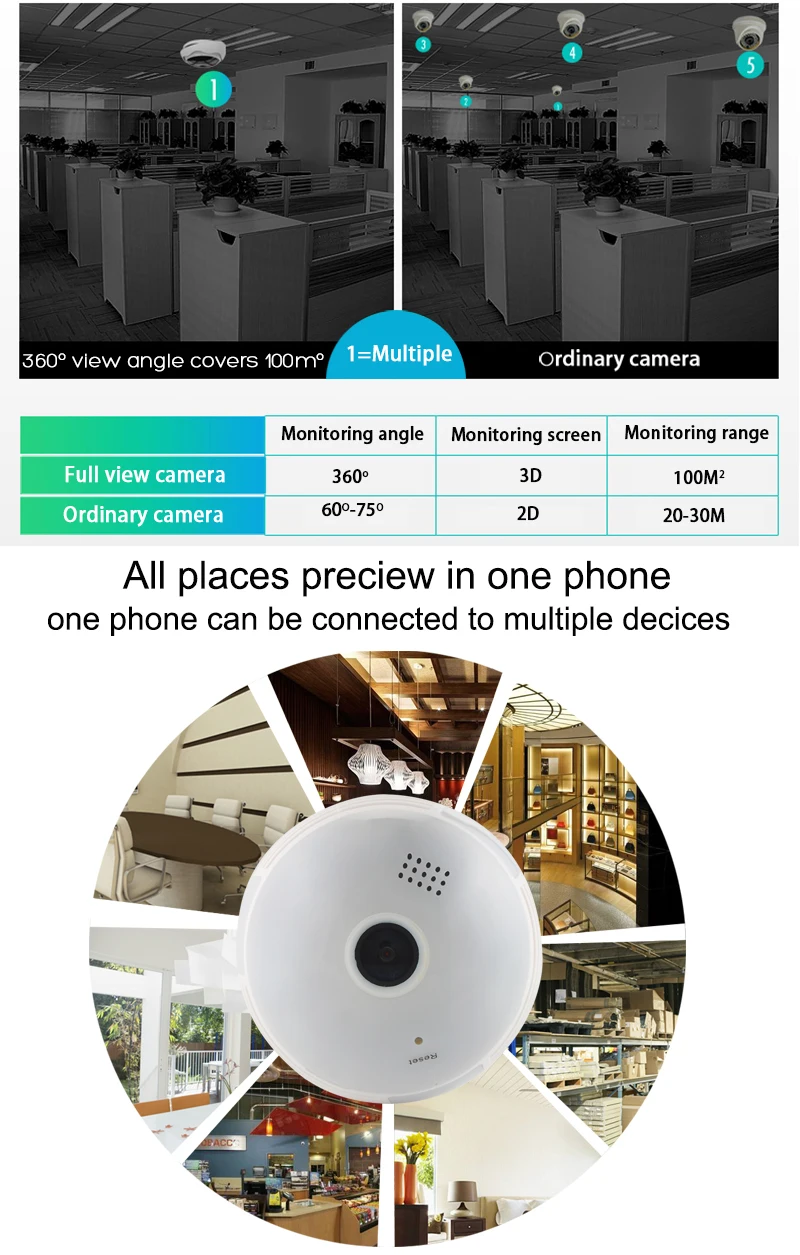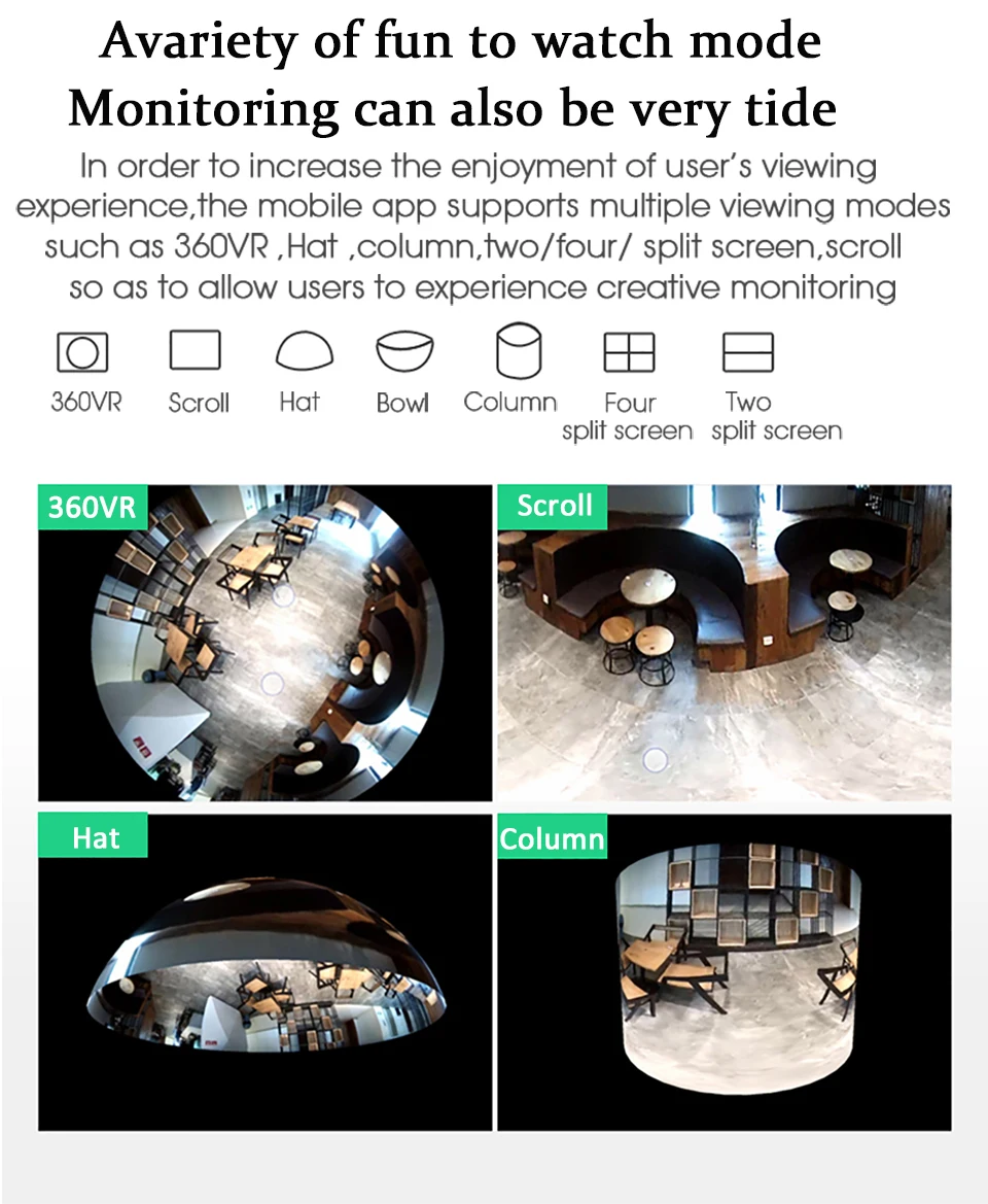 1.3MP 360°VR PANORAMIC CAMERA Features:Suitable for home, shopping malls, hotels, bars All-glass fisheye lens, 360°VR panoramic view; HD 960P resolution, clear and delicate images; advanced video compression technology, ultra-low bit rate, high-definition picture quality; Support mobile remote monitoring (iOS, Android);