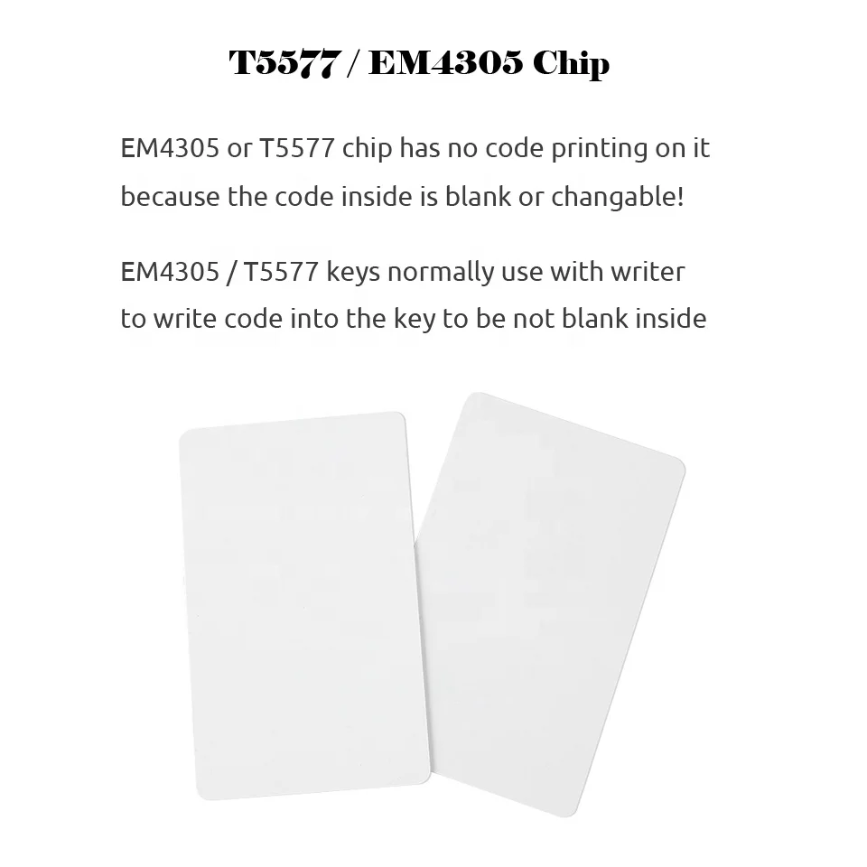 EM4305 / T5577 chip100% Brand NewSize:86 x 56 x 0.8cmMaterial: PlasticOperation frequency: 125KhzRead and rewrite CardDetecting distance: 0-10cm Depend on ReaderCompatible with all Door Entry systemEasy to carryWater resistantCan read and rewriteNo external power required.Brand new key inductive card for entrance guard system.