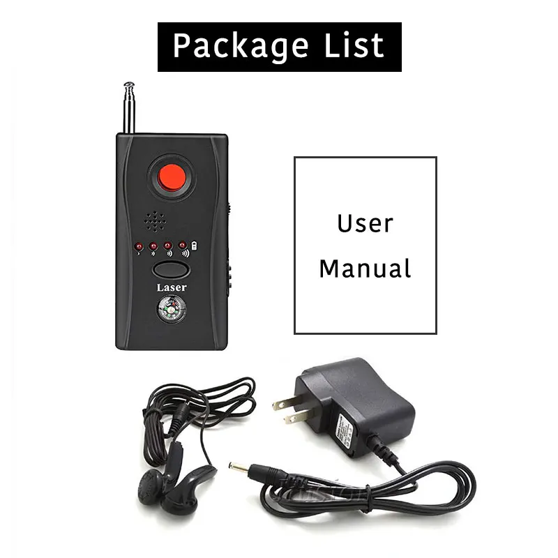 CC308+ Mini Anti Candid Camera Detector Anti-Spy Hidden Camera Laser Audio Signal Bug Small Full-range WiFi RF GSM Device Finder Function: This detector can detect and locate any wired, wireless hidden camera and RF device with working frequency between 1MHz-6.5 GHz, including GSM, VHF, UHF bugs, trackers. It can also detect and locate spy camera lens through laser scanning It is equipped With auto-detecting function, once it detect bugs, it will vibrate, beep and LED light flicker. Feature: ▶【 Accurate & Fast Detection】This professional anti spy detector can accurately detects the position of Hidden Cameras,Audio Bugs and GPS tracking within a few minutes through the RF frequency detection.It can effectively prevent eavesdropping, candid photos and personal privacy leaks. ▶【 Adjustable Potentiometer Sensitivity】Super-high sensitivity with adjustable threshold, stronger anti-jamming, wider range of detection frequency. The signal detection device can adjust the sensitivity according to the actual needs. By Adjusting The Potentiometer, Increasing/Decreasing The Sensitivity Can Expand/Reduce The Detection Range.Camera detector can quickly identify the source signal waves with the help of equipped strong signal indicator light. ▶【 Multi Detection Mode】Choose detection mode from five modes,included Laser detection,Vibration (Mute) detection, Beep detection, LED display detection, Headset mode to efficiently find the suspicious item. (Laser Detection: Eyes can see all facing camera lens within sight through the host Windows) ▶【 Small size & Longer Standby Time】The size of the signal detector is very small, can be held in the hands, wearing headphones can be judged according to the size of the sound of the alarm sound around the spy equipment, to facilitate your exploration in some special occasions.Updated Bug detector set with longer standby time, advanced chip-making technology and more durable material. ▶【 Signals Radiation Warning】 The wireless detector can detect whether there is intense radio signals radiation around the living and working environments, whether there is strong electromagnetic radiation leaks to do harm to our health from the household appliances, such as refrigerators, computers, or suspicious wireless signals. Specifications: ✔Radio Wave Detection Camera Distance:5cm-l0m(The Range Depends On Transmit Power Of The Camera) ✔Power In The 50mv-200mv Detection Range: 30-50cm/50-200mv; 100-200cm/300-600mv;300-800cm/800-1200mv ✔Built-in rechargeable battery with low-voltage warning ✔Rubberized coating, high temperature resistant ✔Built-in compass ✔Power: Built-In Lithium Polymer Battery 450mAH ✔Probe Laser Wavelength: 920nm ✔Receive Frequency Range: 1Mhz-6500MHz ✔Current Consumption: 8mA ✔External Material: ABS ✔Size: 93mm*48mm*17mm ✔Weight: 58g/2.05oz Packing List: 1 * Full-frequency Detector CC308 + 1 * Earphone 1 * Charger 1 * User Manual Note: 1. No Retail Packing Box 2. ONLY when the spy device sending out wireless signal can this detector find the spy device signal. Red laser light as an option for finding camera lenses