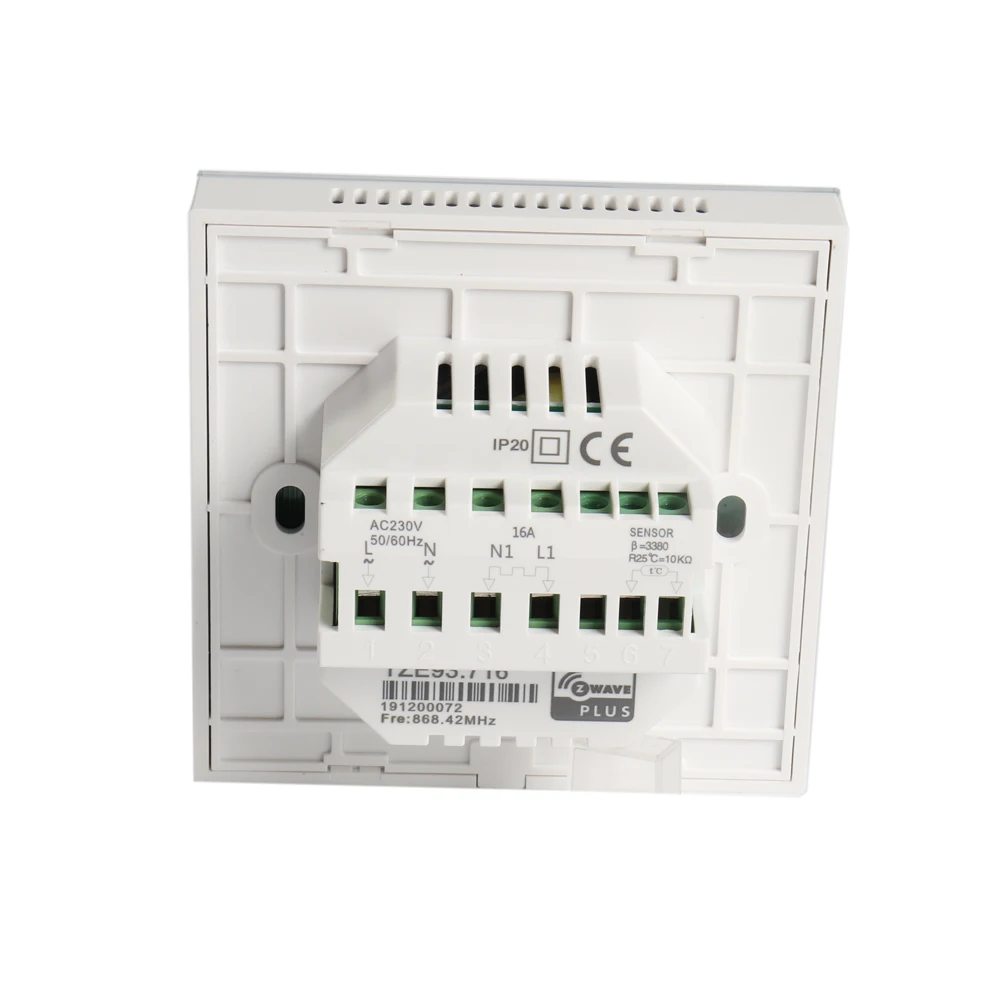 The TZE93.716 is a heating thermostat with LCD screen and built-in Z-Wave Plus technology. The thermostat is designed to fit into your flush box and control your electric heating or on/off actuator valves used in hydronic heating. The thermostat is mains powered and has an internal temperature sensor built in and an external sensor included in the scope of delivery. To use both sensors you have to connect the external sensor to the thermostat. Then the thermostat allows to switch between the 2 different sensors. The display shows the value of the chosen temperature sensor and allows adjusting the temperature of the connected heating system. The temperature can be adjusted in steps of 0.5° C.Advantages: