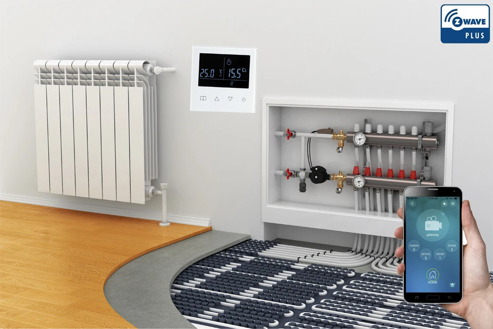 Use zwave plus technology,Control the temperature of your home on your phone or tablet from wherever you are with a smart thermostat. They also help you save money on energy bills with auto-adjust heating and cooling that shuts down when your home is empty.