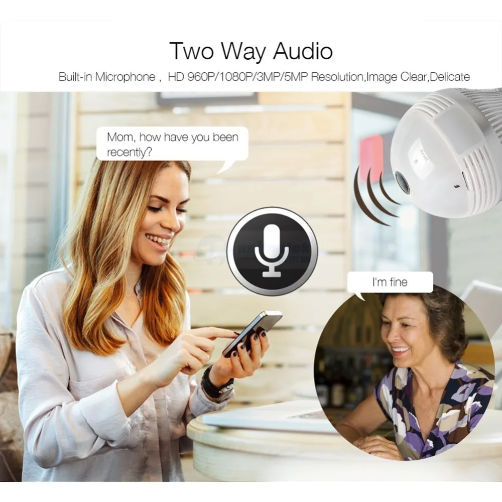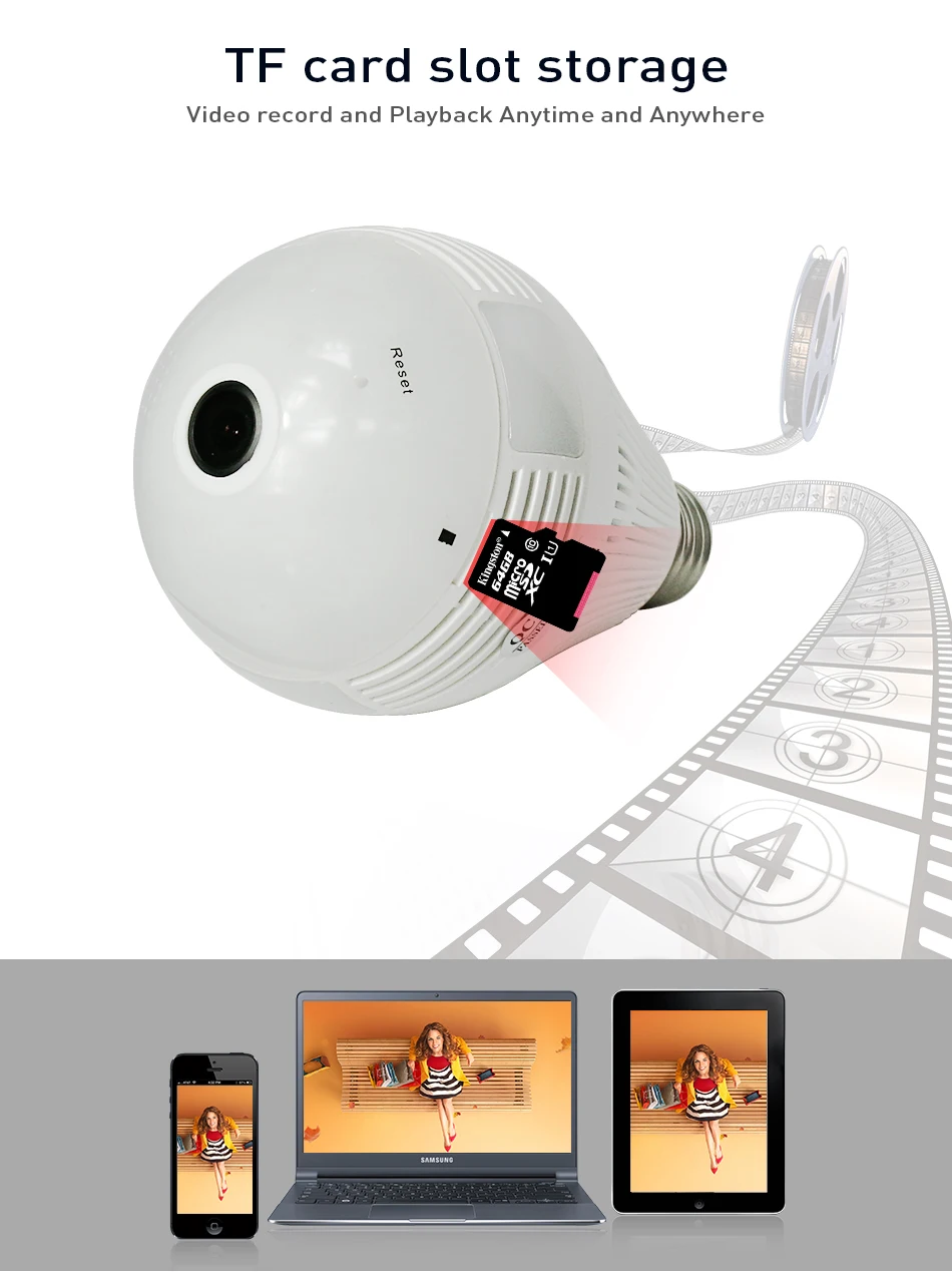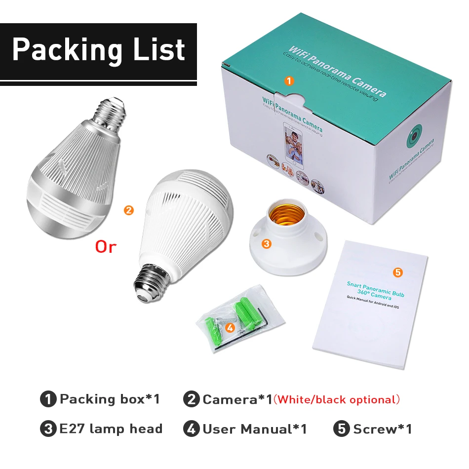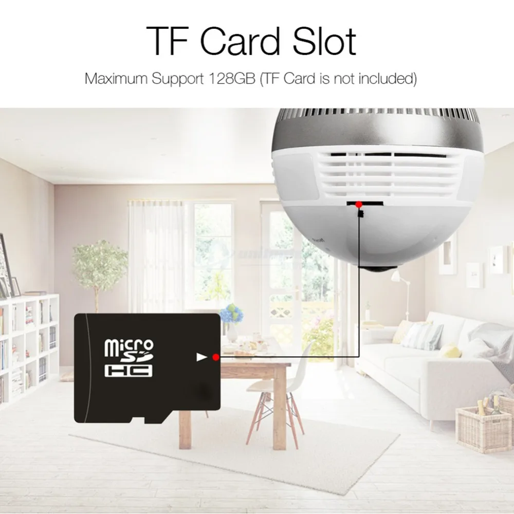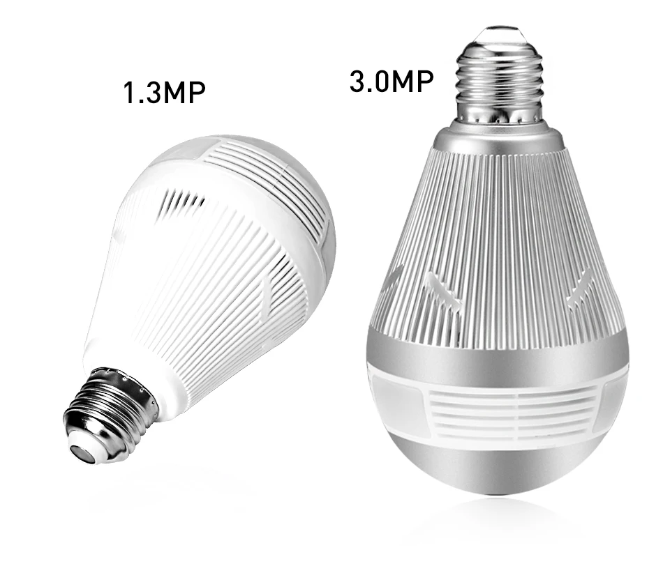 Bulb Light Wireless IP Camera Wi-fi FishEye 3MP 360 degree VR CCTV Camera 3MP Home Security WiFi Camera Panoramic 1. 360 degrees panoramic view; TIP 1. This camera has 1.44mm fisheye lens. 2. This camera provide Two-way audio function .and support 64Gb MAX to record . 3.WiFi not support 5G,Only Support 2.4G 1.3MP/3MP for option Fisheye lens,super wide view angle 1pcs camera replace multi normal cameras Two Way Audio Motion detection and email alert Variety view modes Easy remote access via mobile TF Card Storage Packing List 1,Packing Box *1 2,3MP Mini fisheye IP network camera*1 3, E27 lamp head *1 4,User Manual *1 5,screws*1 set