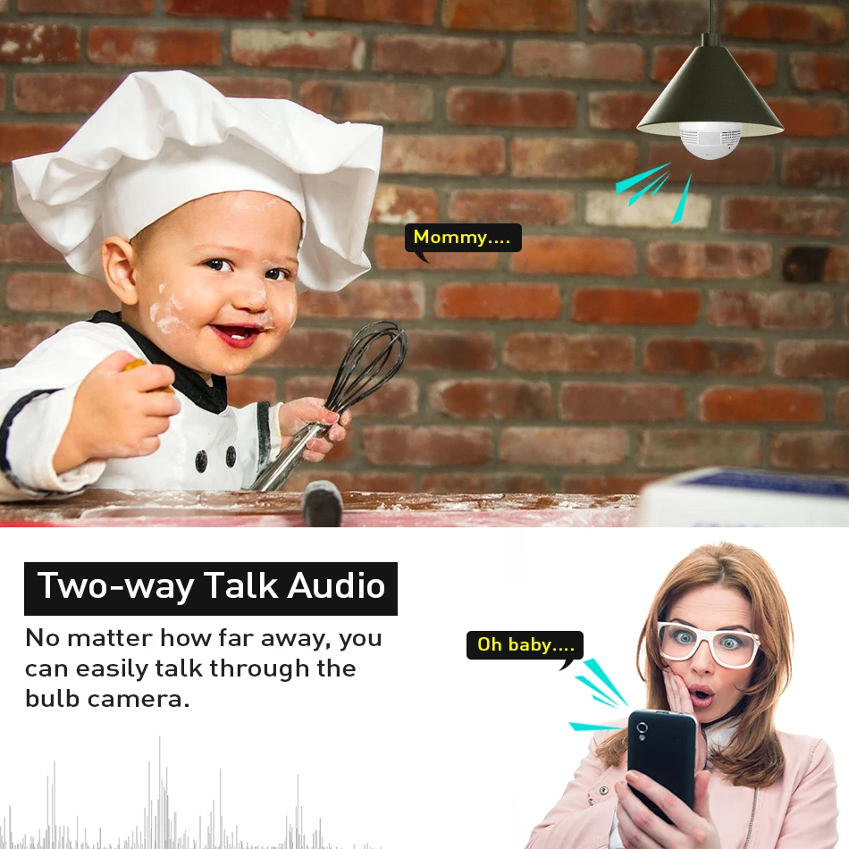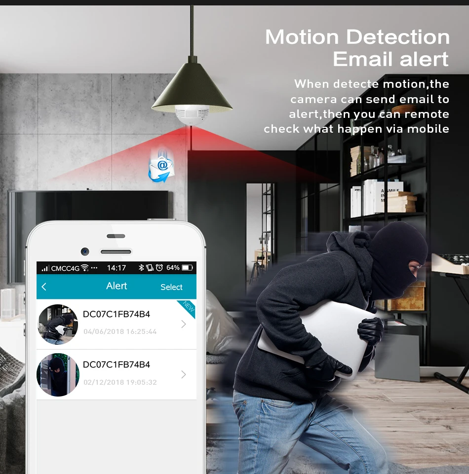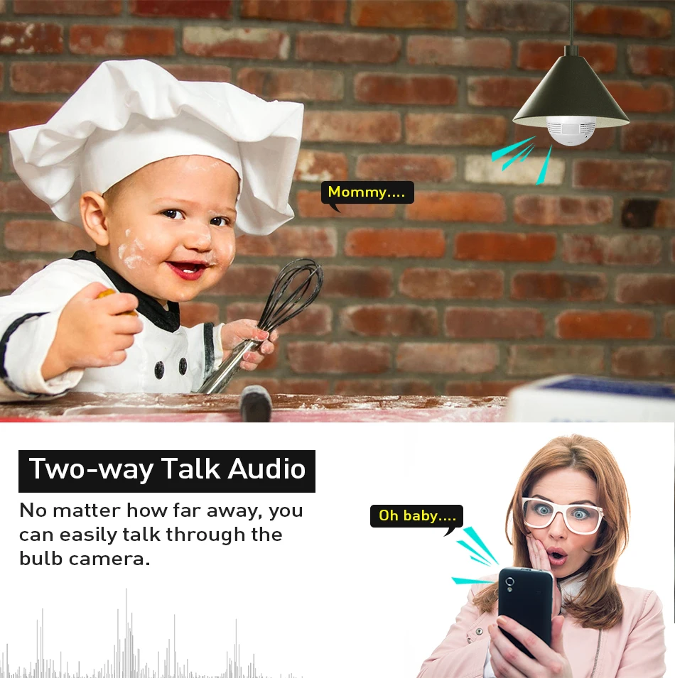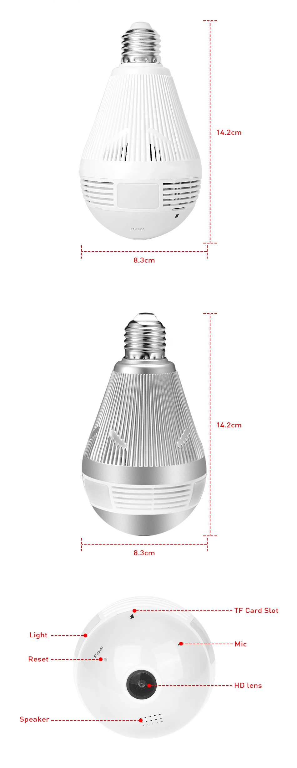 Bulb Light Wireless IP Camera Wi-fi FishEye 3MP 360 degree VR CCTV Camera 3MP Home Security WiFi Camera Panoramic 1. 360 degrees panoramic view; TIP 1. This camera has 1.44mm fisheye lens. 2. This camera provide Two-way audio function .and support 64Gb MAX to record . 3.WiFi not support 5G,Only Support 2.4G 1.3MP/3MP for option Fisheye lens,super wide view angle 1pcs camera replace multi normal cameras Two Way Audio Motion detection and email alert Variety view modes Easy remote access via mobile TF Card Storage Packing List 1,Packing Box *1 2,3MP Mini fisheye IP network camera*1 3, E27 lamp head *1 4,User Manual *1 5,screws*1 set