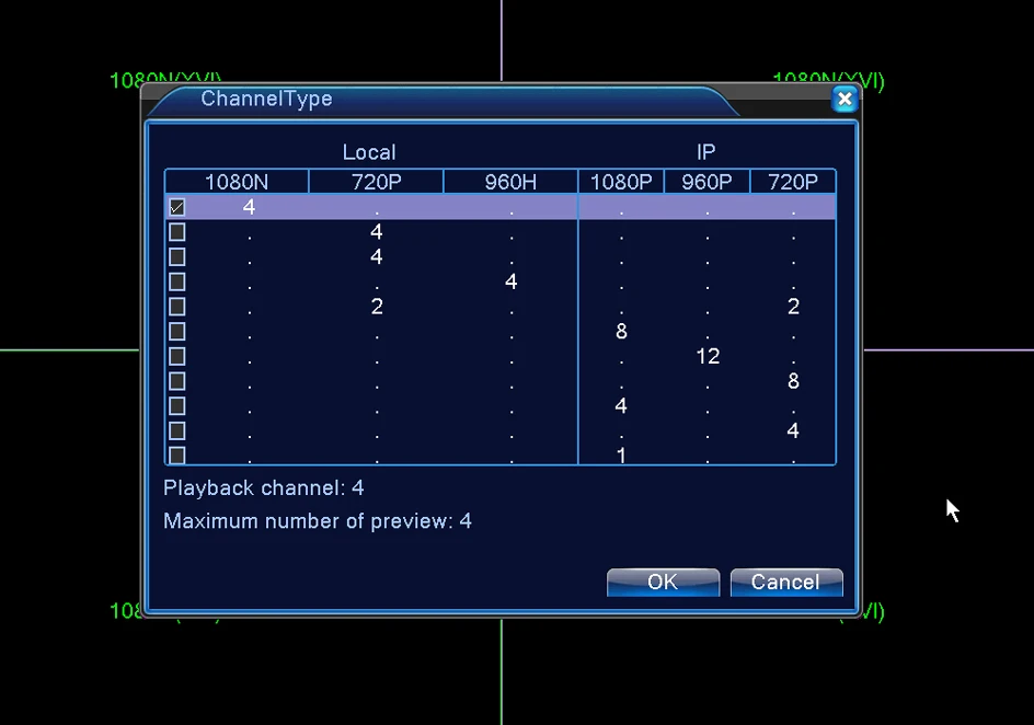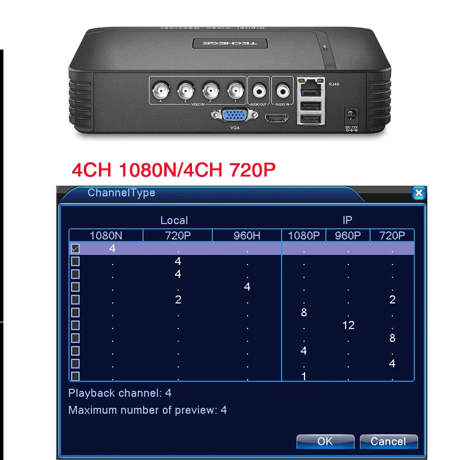 1080N=960*1080720P=1280*7204CH DVR(4CH 1080N/4CH 720P AHD camera)