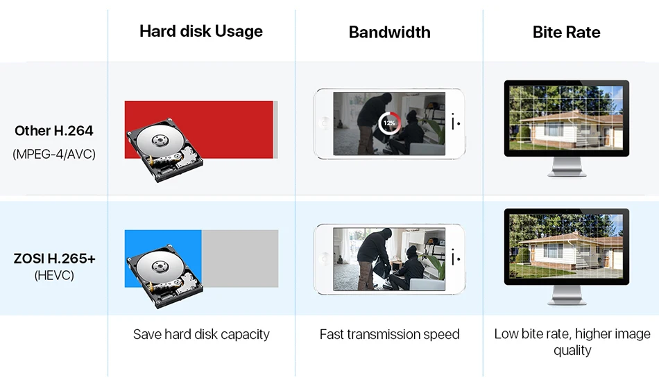 Save Hard Disk CapacityLower Bandwidth,Fast Transmission SpeedLow Bite Rate,Higher Image Quality