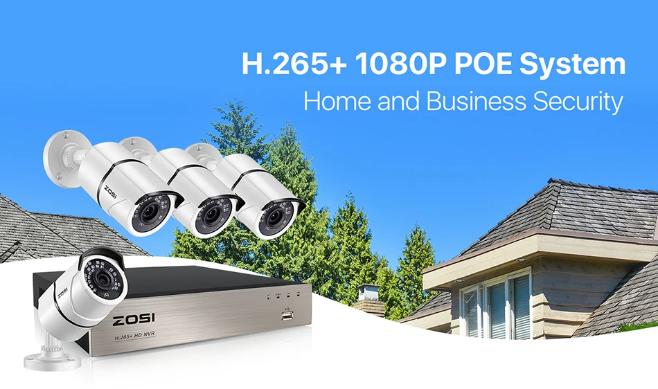 | ZOSI New 5MP POE Video Security System and (4) 2-Megapixel Outdoor Bullet 2MP 1080P IP Cameras with 120ft Night Vision |
